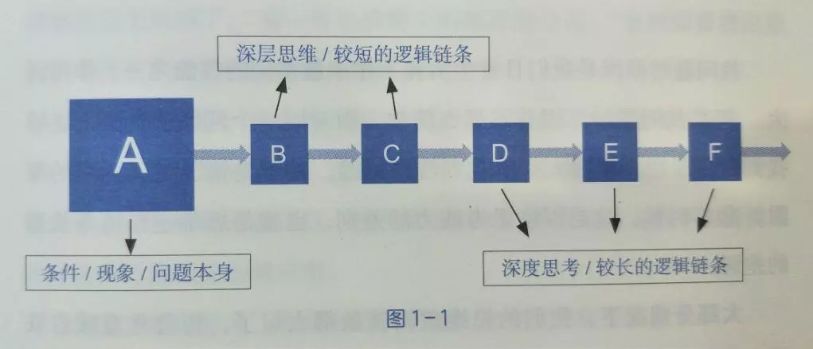 用策略师叶修先生的话说,“浅度思维”分为四种: 第一种浅度,是逻辑链条的短浅,无法认知较长的因果链条。 比如,走象棋的时候只能考虑1-2步,解数学题的时候只能往后推论1-2级,又或者对事情发生时的原因只能分析出最浅近的直接原因。 比如我们在沟通、规划、写文案等事项中,往往只从自己的思考出发,而无法切换到别人的视角上去换位思考。 如果要求在短时间内处理大量问题,很多人的思维能力是跟不上的。心理学研究发现,信息过载的状态既会带来思考效率的低下,也是造成拖延症的原因之一。 比如我们容易在日常的工作中精打细算,却未能对长期趋势进行研究,把握并据此进行人生规划;或者我们常常只关注和研究个体,而对个体与环境的复杂关系缺乏了解;又或者,我们紧盯手头一个个零散的事项,而对整个任务的宏观流程缺乏认知和掌握。 深度思维: 能够拥有较长的思维逻辑链,能够认知较长的因果链条; 能够突破自我中心的局限,灵活切换看待问题的视角; 能够处理较大的信息量,在杂乱的信息流中保持思维能力; 能够在宏观视角上分析问题,认知事物所处的生态的特性、事物的长期趋势等。 面对生活、工作、学习中的诸多问题和任务,我们需要高效的深度思维方法去分析和解决它们,在众多的深度思维方法中,“逻辑思维链”是个很基础但是很好用的模型。